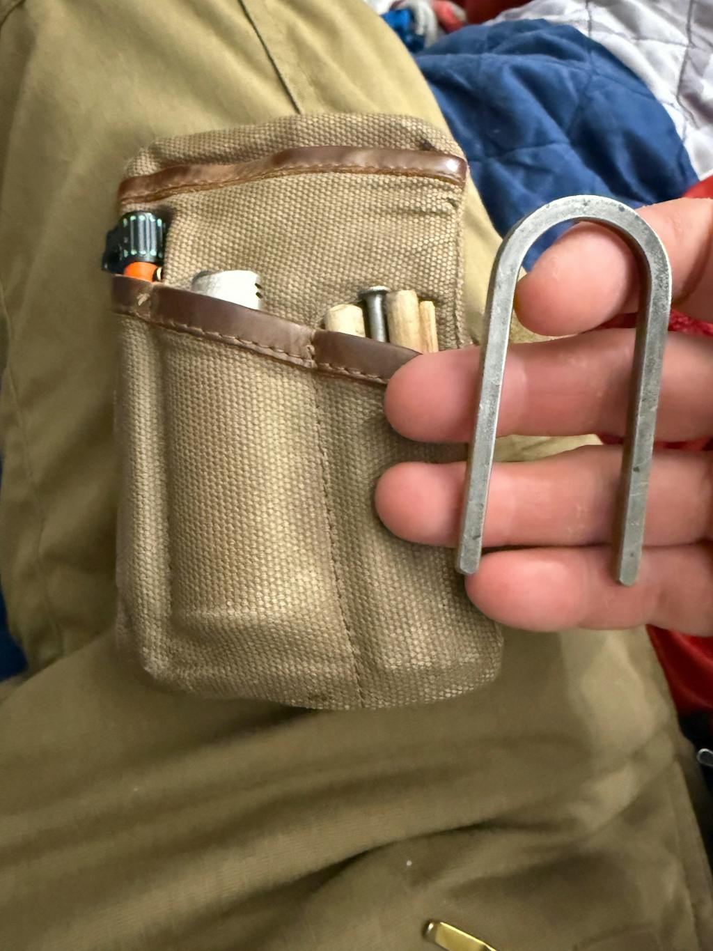 This kit comes with a U-shaped steel striker, flintstone, lamp wick char cloth, and a velour drawstring bag.